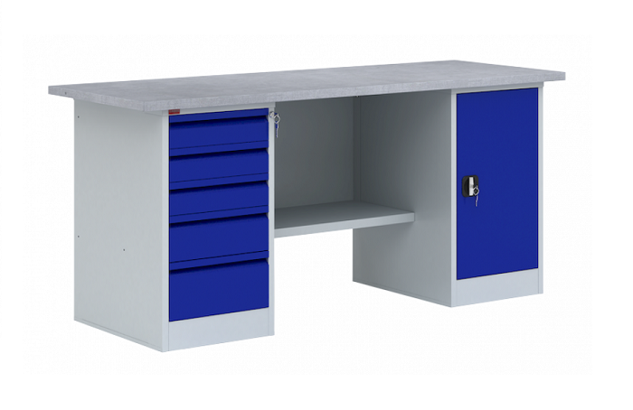 Металлические слесарный верстак ВП-4 представляет собой рабочий стол для ручной обработки металлических, деревянных изделий, а также предметов, выполненных из других материалов. Металлический верстак используется в мастерских, гаражах, автосервисах и в других рабочих зонах. Он являются основой, как небольшого промышленного производства, так и крупного предприятия. Допустимая равномерно распределенная нагрузка на верстак - 1000 кг, на полку верстачную - 40 кг, на выдвижной ящик и полку тумбы Т-1 - 30 кг. В комплект верстака ВП-4 входит: столешница СТ-3 из МДФ, покрытая оцинкованным листовым металлом, стенка задняя металлическая, тумба Т-2 с пятью выдвижными ящиками, тумба Т-1 с двумя съемными полками. Тумбы закрываются ключевым замком. Дополнительно на верстак можно установить перфорированный экран соответствующего размера, аксессуары на экран. Цвет: верстак - серый Ral 7035, дверь тумбы - синий Ral 5002